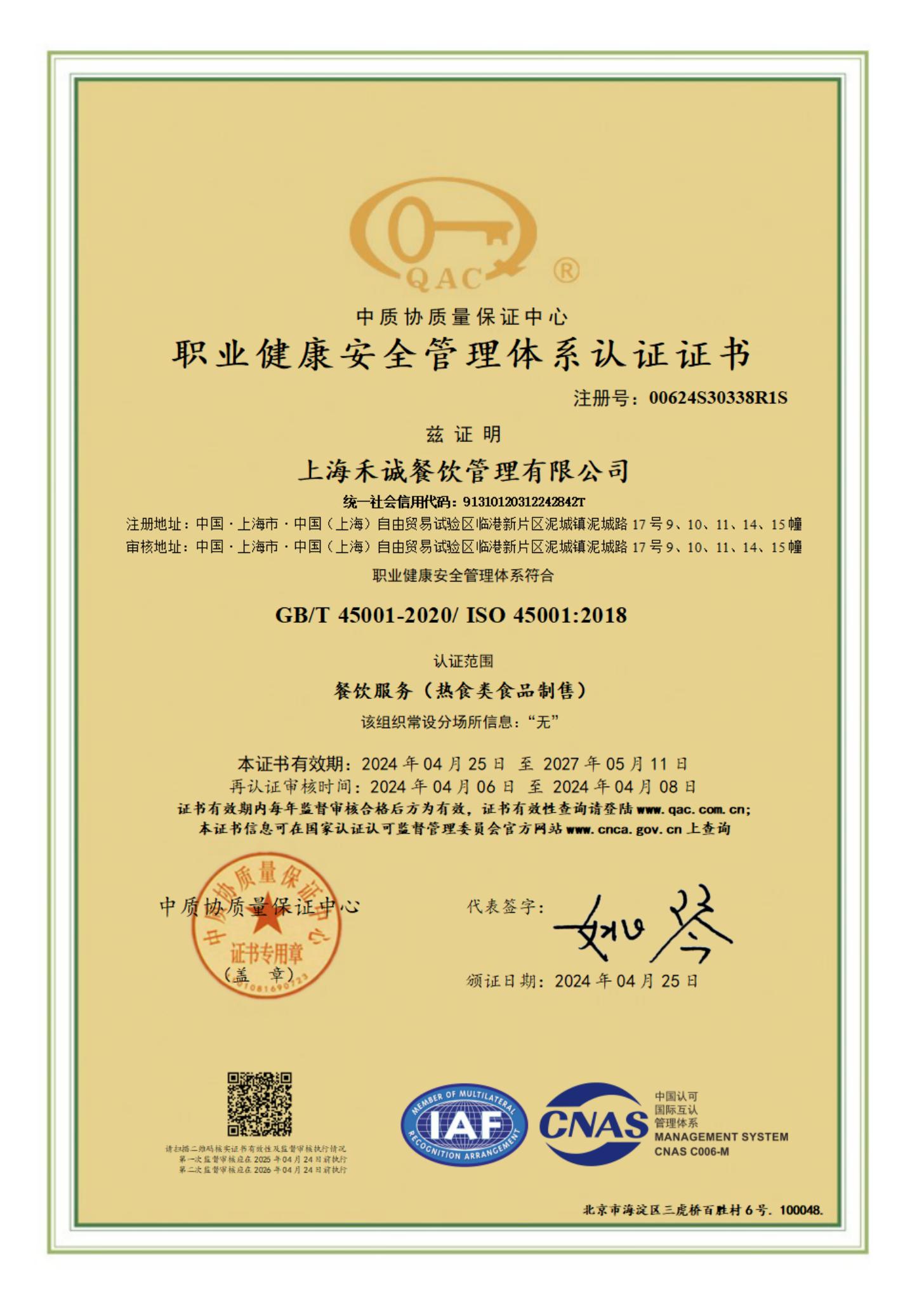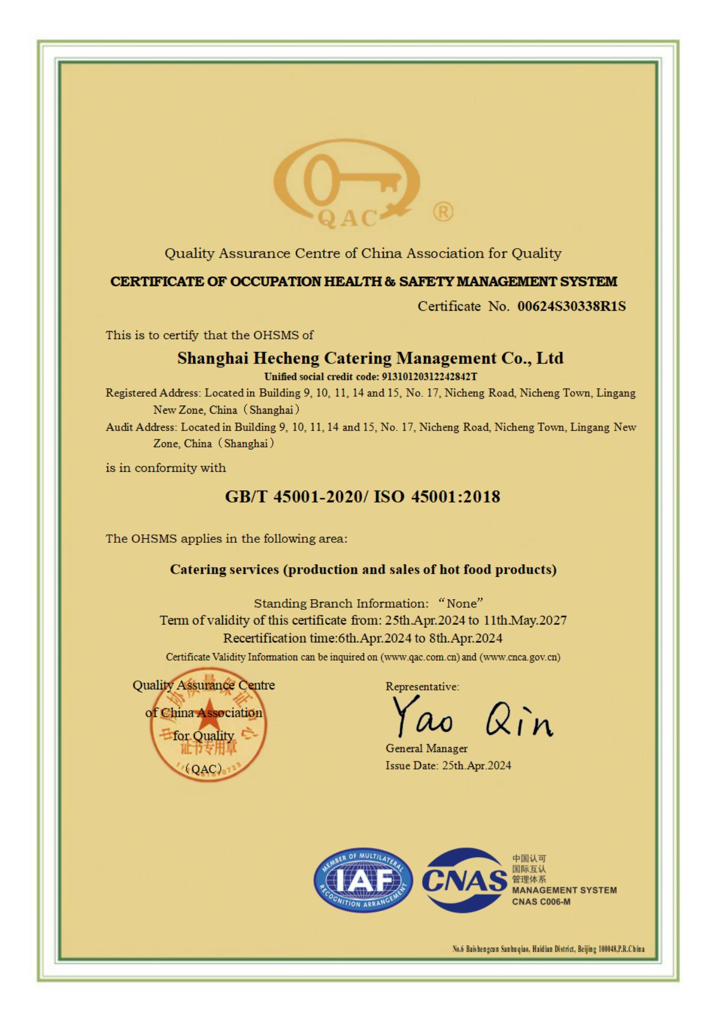 职业健康安全管理体系认证证书英文