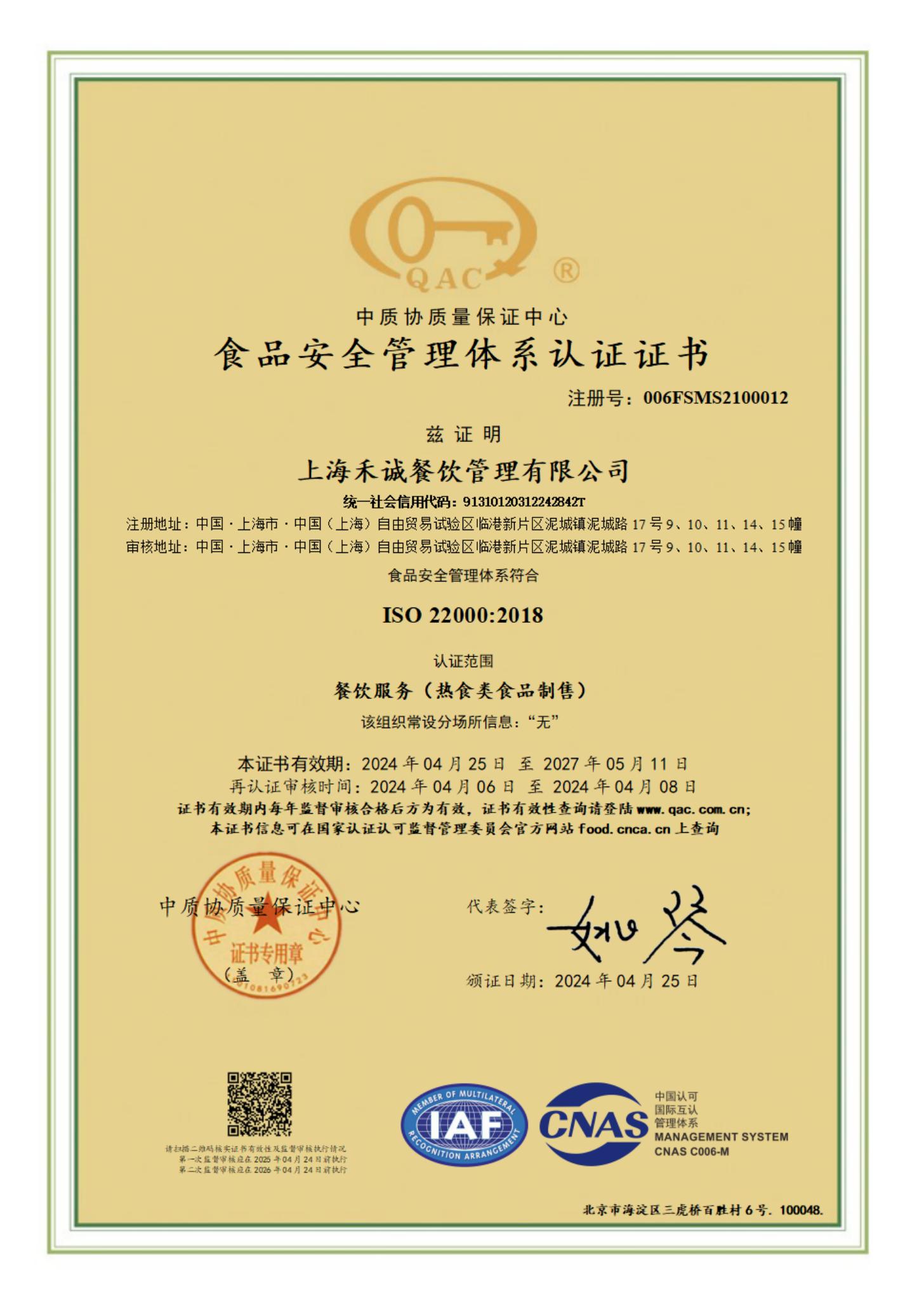 食品安全管理体系认证证书