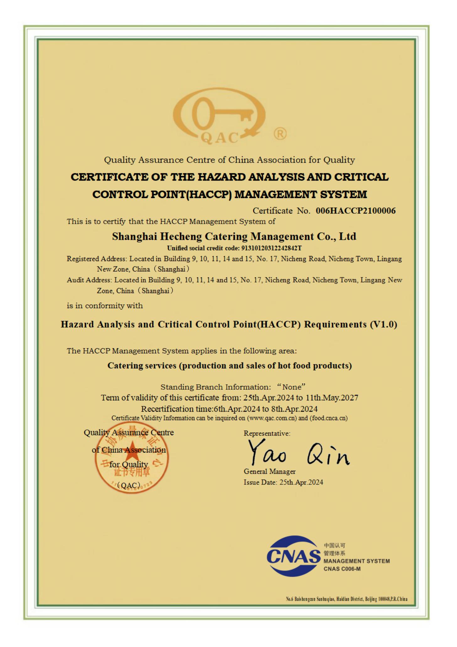 危害分析与关键控制点(HACCP)体系认证证书英文