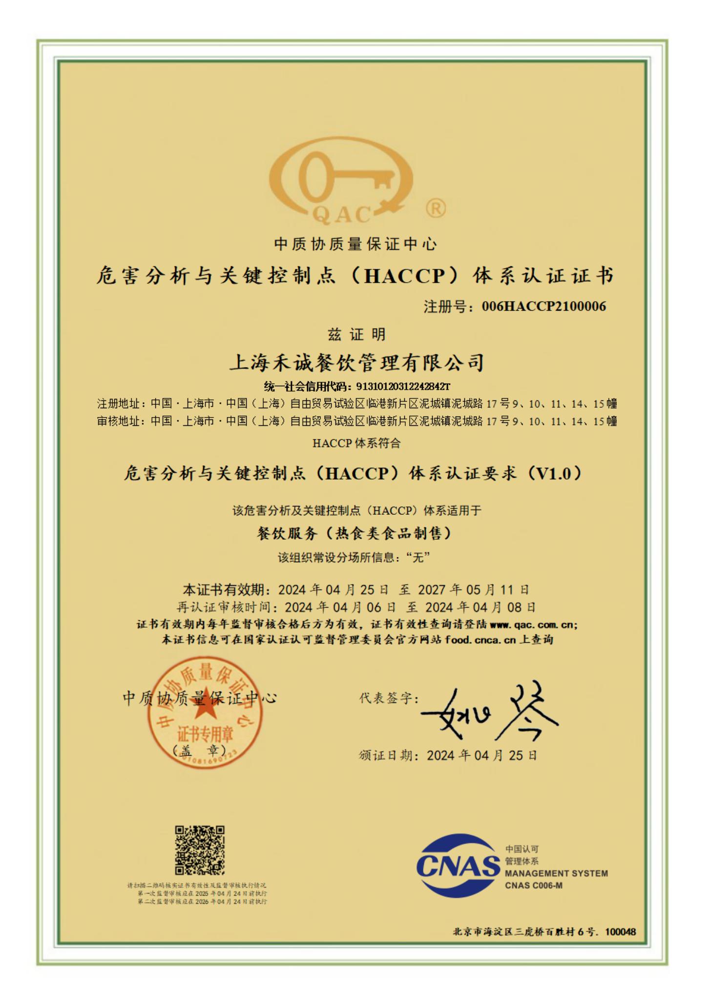 危害分析与关键控制点(HACCP)体系认证证书